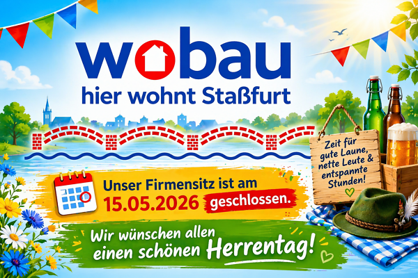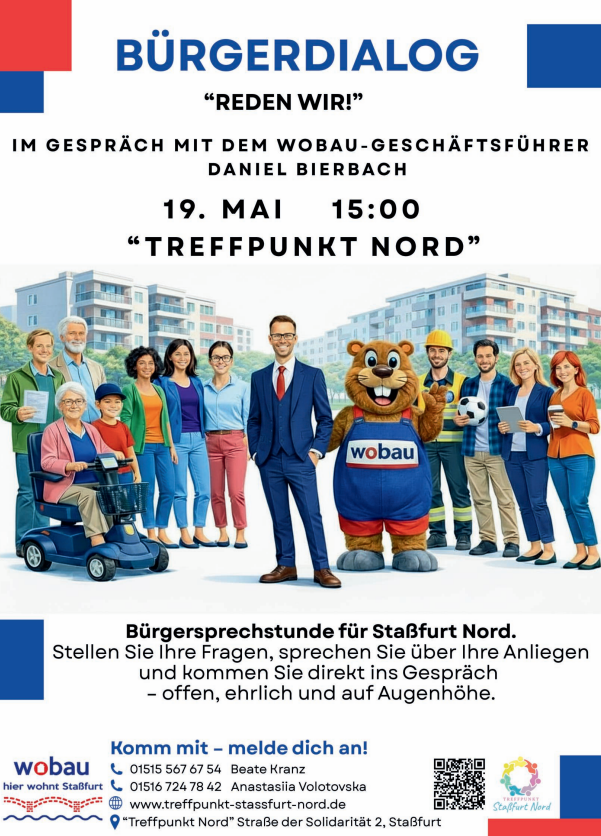 Die WOBAU Staßfurt lädt am 19. Mai herzlich zu einer offenen Gesprächsrunde ein. Eingeladen sind alle Interessierten, die mehr über unser Unternehmen, unsere Arbeit und zukünftige Entwicklungen erfahren möchten oder eigene Fragen und Anregungen einbringen wollen. Im Rahmen der Veranstaltung wird der Geschäftsführer persönlich vor Ort sein und für Gespräche zur Verfügung stehen. Dies bietet eine gute Gelegenheit, direkt in den Austausch zu treten, Einblicke zu gewinnen und unterschiedliche Perspektiven kennenzulernen. Wir freuen uns auf zahlreiche Teilnehmende, spannende Gespräche und einen regen, konstruktiven Austausch.