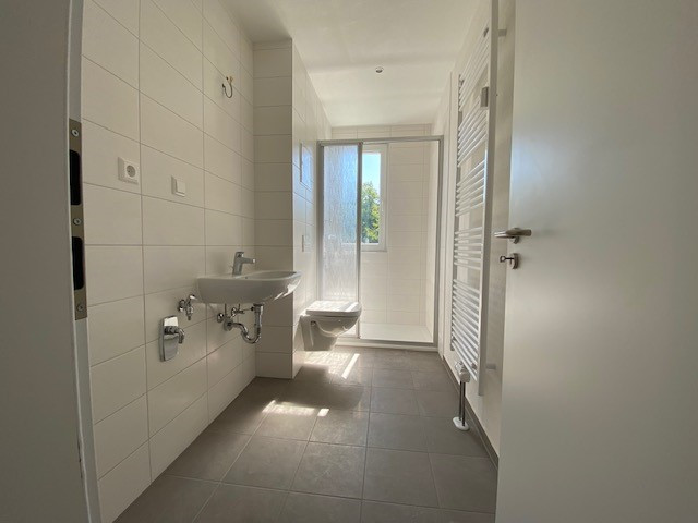 Das hell geflieste Bad hat eine bodengleiche Dusche und auch für die Waschmaschine ist noch genügend Platz.