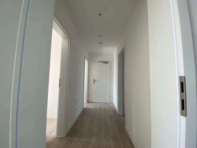 Der Balkon ist nach Westen ausgerichtet. Alle Türen sind weiß und der Bodenbelag ist in Holzoptik gehalten.